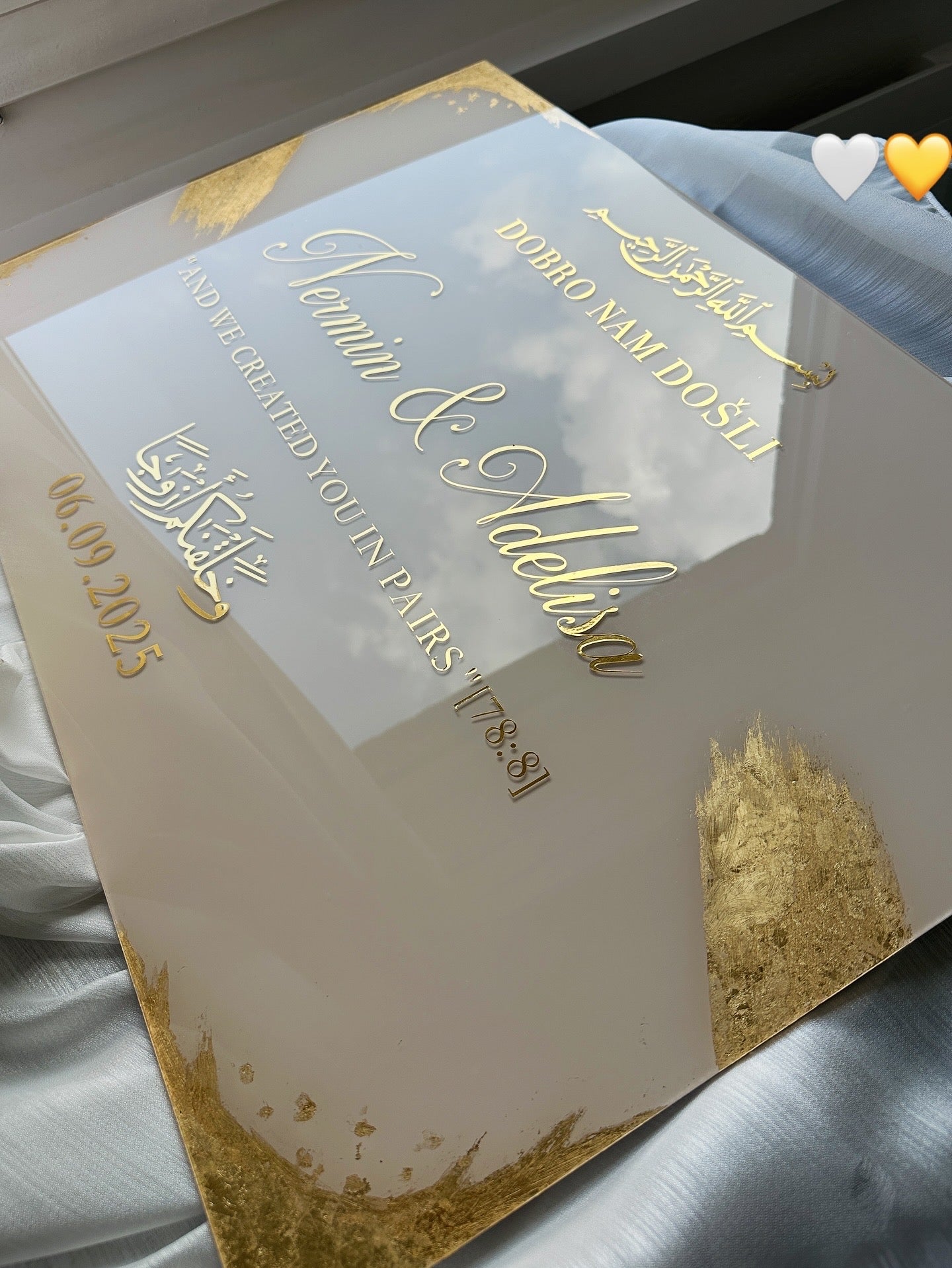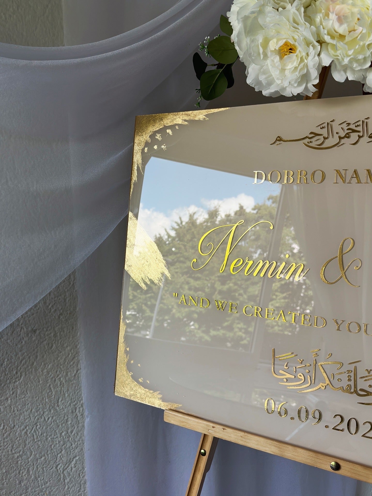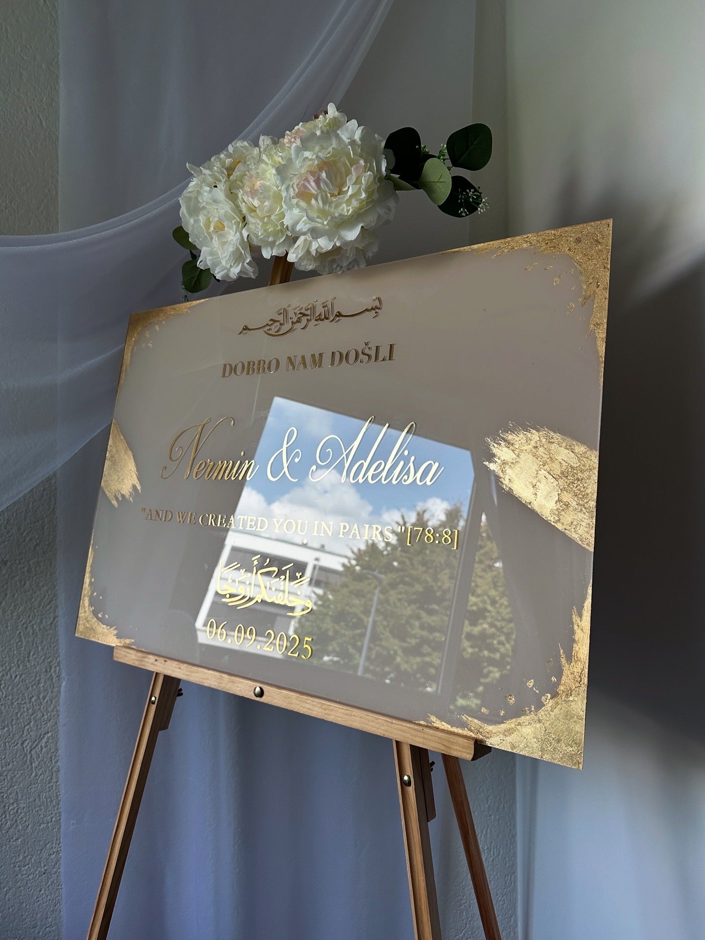 Ein personalisiertes und handbemaltes Willkommensschild für euren besonderen Tag, veredelt mit goldenen Akzenten an den Ecken und Seiten.